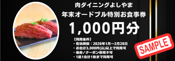 年末特製オードブル(5〜6人前)または年末肉盛りオードブルをご購入のお客様限定で、2026年1月からご利用いただけるお食事券をプレゼントいたします。